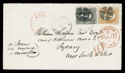 light strike of Washington, D.C.Jan 5 c.d.s., additional clear s#77, 15c Black, along with 30c Orange (#71), just fine singles of each tied to attractive 1867 cover to Sydney, New South Wales by circular segmented cork cancels, along with light strike of "Washington, D.C./Jan 5" c.d.s., additional clear strike to left, New York exchange c.d.s., London Paid transit c.d.s and "40" rate handstamp all in red and on front of cover, "Ship-Letter/Mr 19 1867/Sydney" arrival backstamp, very fine; a choice example to this scarce destination. (Image) Est. $500-750