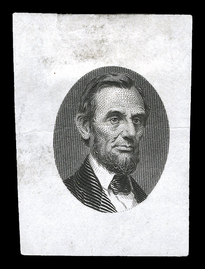 approximately 21x29 mm, with a small tear and crease, still of very fine ap#122-E4c var., (90c) Lincoln, vignette only die essay on India, two examples, one being the Scott listed essay of the vignette (catalog $2,500.00), in black and measuring approximately 21x29 mm, with a small tear and crease, still of very fine appearance; and a second vignette die essay on India mounted on small card measuring 24x25mm, this one in Gray black and has an extra oval frame now added surrounding vignette, unlisted in Scott as such, very fine. (imagea) (Image) Est. $500-750
