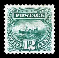 impression, extremely fine a large-margined gem 1998 PSE certificate#117, 12c Green, a most impressive unused example, featuring extraordinarily large and wonderfully well balanced margins all around, luxuriously rich color and a deeply etched impression, extremely fine; a large-margined gem; 1998 PSE certificate. (Image) $950.00