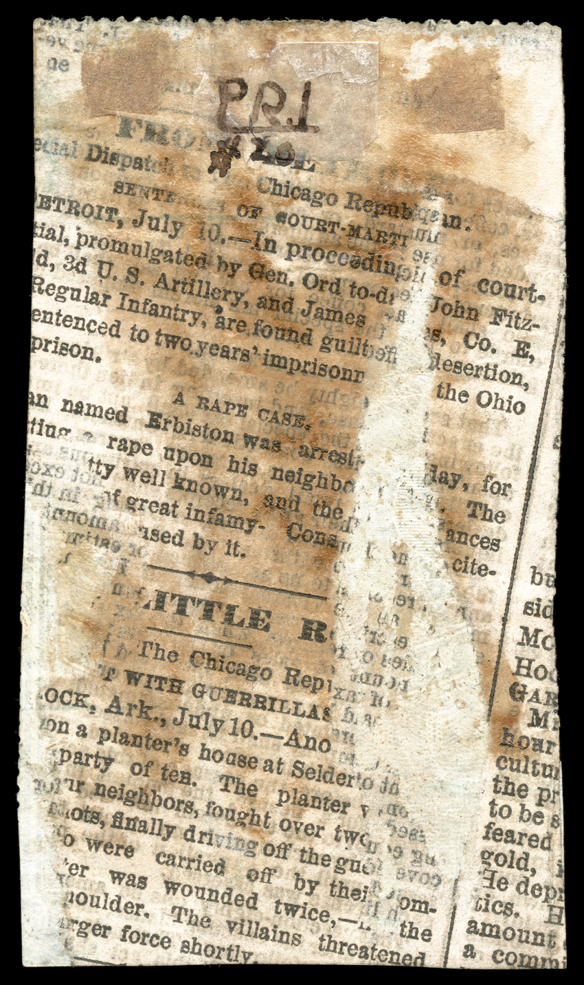 newspaper still adhering to the reverse, faults but fully intact, fine#PR1, 5c Dark blue, attractive appearing single with top sheet margin, deep color and a Chicago, Ill. c.d.s. and quarter cork handstamp, with small pieces of the original newspaper still adhering to the reverse, faults but fully intact, fine appearance; one of the most desirable used examples of #PR1 available, being the only recorded First Issue Newspaper stamp with a town datestamp; 2004 PF certificate; ex-Braceland, Kotanchick. (Image) $2,000.00