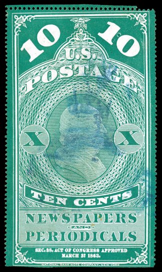 as a used First Issue newspaper stamp gets), very fine for this actua#PR2, 10c Blue green, partial sheet-margin at top, unusually light blue brush stroke cancel, clipped perfs. at bottom, otherwise completely sound (this stamp is about as sound as a used First Issue newspaper stamp gets), very fine for this; actually one of the finest quality copies available; 2004 PF certificate. (Image) $1,800.00