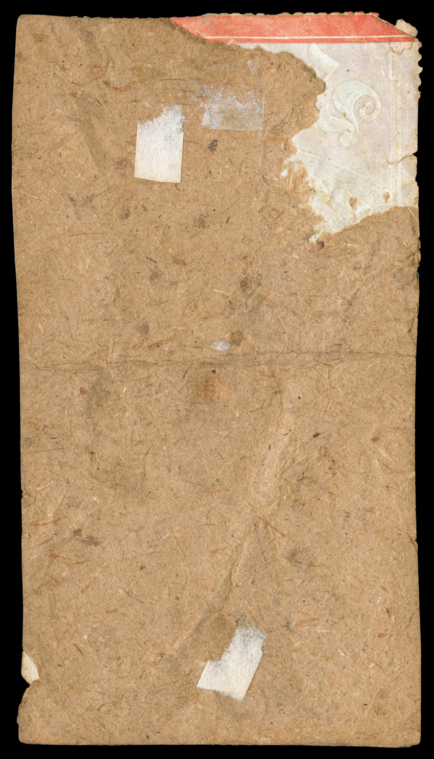 this is the only way to obtain on on piece example of the Twent#PR3, 25c Orange red, bold blue brush stroke "P" cancel, still attached to the original kraft newspaper wrapper, various faults including trimmed perforations, fine appearance; this is the only way to obtain on "on piece" example of the Twenty Five Cent value, in fact some students consider this to be an "on cover" example; this and the previously offered Five Cent value (lot 284) are the only two First Issue newspaper stamps still affixed the original piece; 2004 PF certificate; ex-Kotanchick. (imagea) (Image) $2,400.00