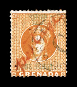 single circle GrenadaC c.d.s. of Sauteurs just showing the 86 ye#18, 1886 1p Revenue with red manuscript "Postage" provisional overprint, bright color, usual centering for the basic revenue stamp, tiny corner perf. crease at top left, clear single circle "Grenada/C" c.d.s. of Sauteurs just showing the "86" year date, a fine example of this incredibly rare manuscript provisional.Dan Walker, in his exhaustive unpublished census of the manuscript provisional stamps, records just five used copies with the red overprint (two from Greenville and three from Sauteurs), one of which is in the Royal Collection, plus there is one unused example known (the ex-"Sovereign" copy). This stamp is clearly undervalued in the Scott catalog, as it is far more rare than the black manuscript overprint that lists at $15,000.00. In fact, when this stamp was last offered in our 2003 sale of the Dan Walker collection, it realized $16,500.00 (including buyer's premium), despite cataloging only $3,000.00 at the time.Not only one of the important rarities of Grenada, but also one of the key 19th century rarities of the entire British Empire. Accompanied by a 1961 RPS certificate; ex-Messenger, Hackmey and Walker (S.G. #29 footnote; the red overprint not priced separately). (Image) $11,000.00
