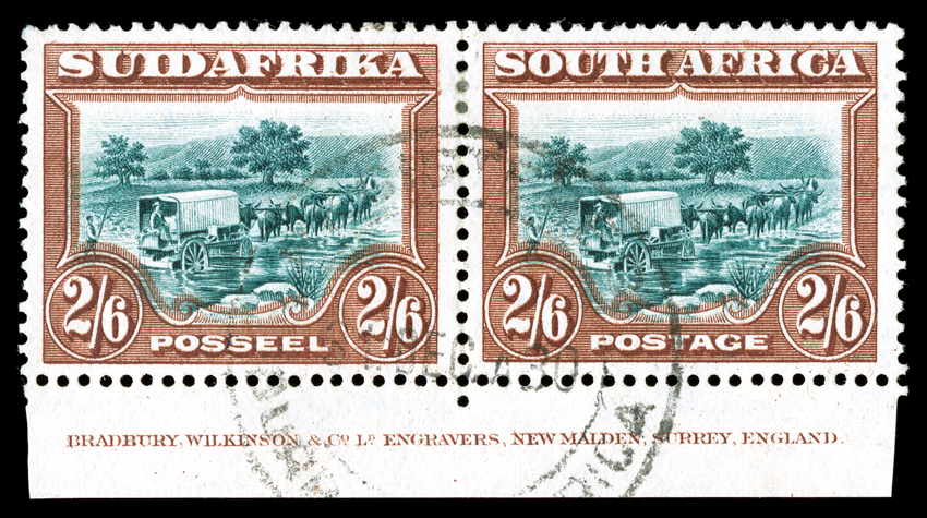 accompanied by a 2000 Philatelic Federation of Southern Africa cert#30, 31, 1927 2/6 Brown and blue green, 5/- Deep green and black, each is a bottom margin imprint horizontal pair, bright rich colors, c.d.s. cancels, fine-very fine; each is accompanied by a 2000 Philatelic Federation of Southern Africa certificate (S.G. #37-38; £1,000). (imagea) (Image) $1,050.00