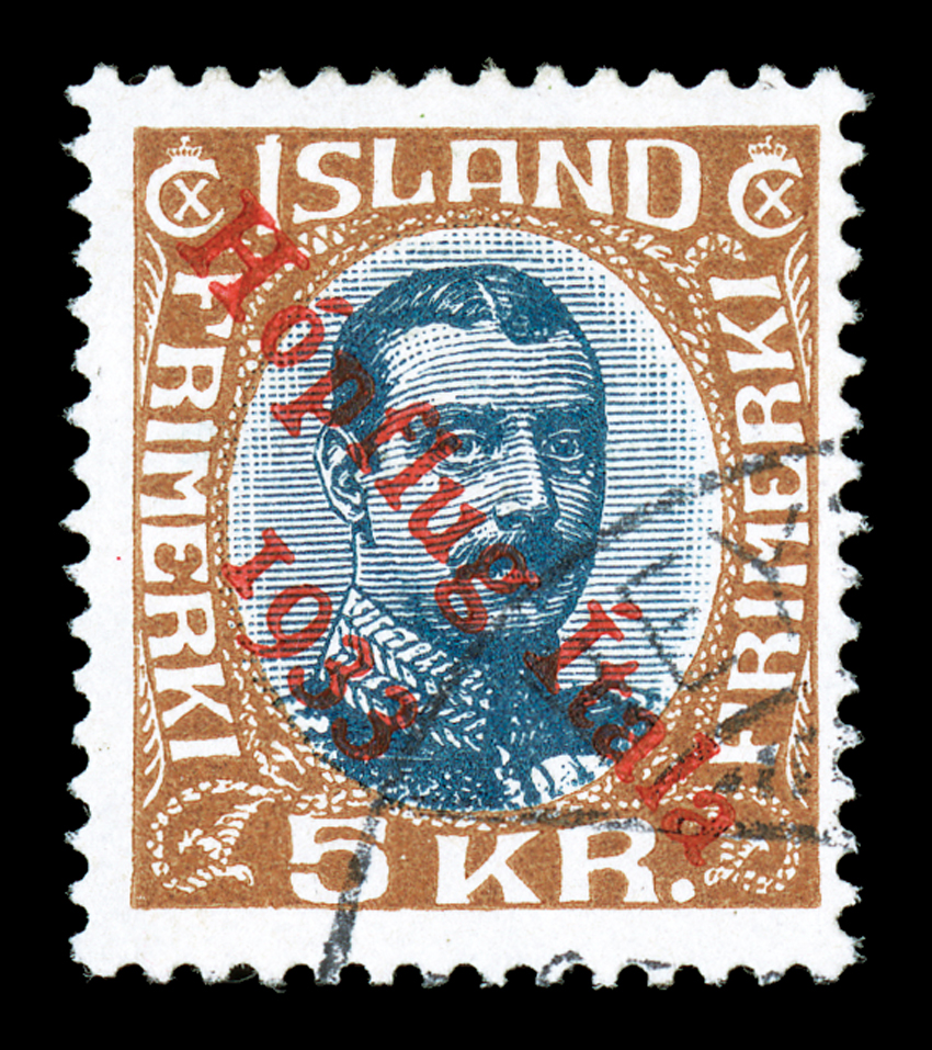 SK5,500).#31, 1897 3a on 5a Green, large type, perforated 13, tied to piece by Reykjavik c.d.s., well centered, fresh and very fine; 1998 Nielsen certificate (Facit #35; SK5,500). (Image) $600.00