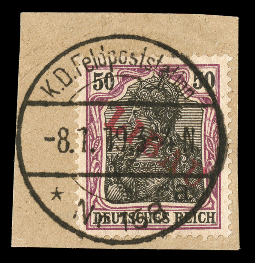 Feldpost c.d.s., bright colors throughout, very fine most are si#1N2-6, 1N8-13, 1919 5pf-50pf "LIBAU" overprints, complete in both red and violet blue overprints except for the 2 1/2pf values (total of eleven stamps), each tied to piece by neat Feldpost c.d.s., bright colors throughout, very fine; most are signed, with the key 25pf and 50pf values of both colors signed A. Schlegel BPP (Michel #1Ba-6Ba, 1Bb-6Bb; €2,560). (imagea) (Image) $1,600.00