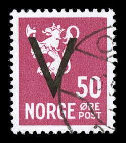 SK4,800).#218, 1941 50o Claret with "V" overprint, well centered, brilliantly fresh, neat c.d.s. cancel, very fine; the scarce key to the "V" overprints; 1999 APS certificate (Facit #277; SK4,800). (Image) $600.00