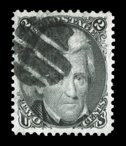 than twenty confirmed used Two Cent 1861 Re-issues, with about hal#103, 2c Black re-issue, nicely centered amid large margins, deep color and a well incised impression on bright paper, unusually light duplex cancel, very fine; there are less than twenty confirmed used Two Cent 1861 Re-issues, with about half of those having faults to some degree, resulting in sound very fine copies such as the example offered here being extreme rarities; accompanied by 1967 and 2002 PF certificates; ex-Stollnitz, Drucker. (Image) $7,000.00