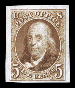 extremely fine.#3, 5c Red brown reproduction, without gum as issued, highly select copy, large to mostly extra-large margins all around, wonderfully bright color and a sharp impression, extremely fine. (Image) $800.00