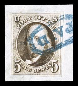 complete strike of blue PAID in octagonal handstamp, very fine and#1a, 5c Dark brown, handsome example with wonderfully deep rich color and impression, plus it features four full to mostly very large margins, tied to small piece by nearly complete strike of blue "PAID" in octagonal handstamp, very fine and quite choice. (Image) $800.00