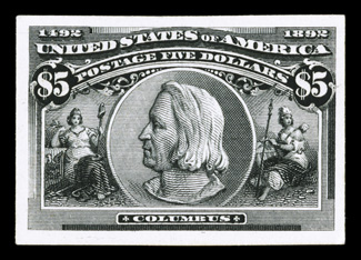 in.#230P4-45P4, 1c-$5.00 Columbians, plate proofs on card all with large margins, bright and fresh, very fine; accompanied by the original envelope these were sold in. (imagea) (Image) $1,435.00