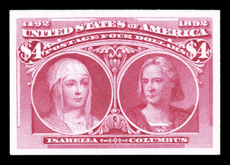 hinged, extremely fine an incredibly large-margined and spectacular gem#233, 4c Columbian, a stunning mint single, being perfectly centered within absolutely gigantic margins, deep intense color and an especially sharp impression, o.g., lightly hinged, extremely fine; an incredibly large-margined and spectacular gem; 2005 PF certificate (Superb 98 Jumbo); the highest grade the PF has awarded this stamp. (Image) $80.00