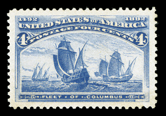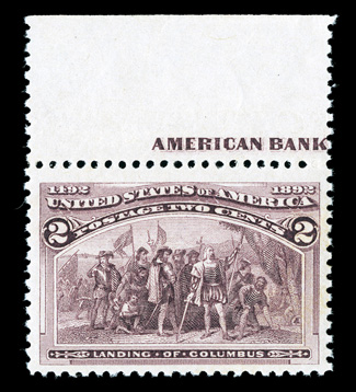 single gum bend or skip, never hinged, an extremely fine gem a most impr#234, 5c Columbian, perfectly centered amid extravagantly large margins, rich luxuriant color and a razor-sharp impression on bright fresh paper, unblemished o.g. without a single gum bend or skip, never hinged, an extremely fine gem; a most impressive never hinged Five Cent Columbian; photocopy of a 2002 PF certificate for a block of four, this being the top right stamp. (Image) $260.00
