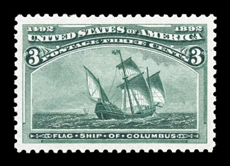 highly detailed impression on bright white paper, pristine o.g., n.h.,#232, 3c Columbian, a striking jumbo-margined mint example, featuring margins of extraordinary size and being incredibly well centered within them, gloriously rich color and a highly detailed impression on bright white paper, pristine o.g., n.h., extremely fine; a handsome gem; 2007 PSE certificate (XF-Superb 95 Jumbo; SMQ $880.00 as 95 and $3,600.00 as 98): ex-"Westchester". (Image) $160.00