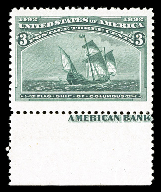 borders, sumptuously rich color and a clean impression on crisp white pap#232, 3c Columbian, a striking bottom sheet-margin single with partial imprint, possessing gigantic margins all around and being wonderfully well centered within these huge borders, sumptuously rich color and a clean impression on crisp white paper, o.g., n.h., extremely fine; a most impressive jumbo. (Image) $160.00