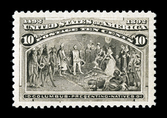 impression on immaculate white paper, full intact perforations all around, o#237, 10c Columbian, a stunning mint single, being incredibly well centered within huge jumbo margins which are seldom encountered, glorious rich color and a razor-sharp impression on immaculate white paper, full intact perforations all around, o.g., never hinged, an extremely fine gem in every regard; 2006 PSE certificate (XF-Superb 95 Jumbo; SMQ $3,300.00 for 95 and $14,200.00 for 98). (Image) $400.00