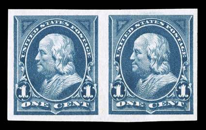364 nh 264a 264a, 1c Blue, imperforate, horizontal pair, large even margins all around, deep rich color on fresh white paper, o.g., never hinged, extremely fine.#264a, 1c Blue, imperforate, horizontal pair, large even margins all around, deep rich color on fresh white paper, o.g., never hinged, extremely fine. (Image) for hinged $275.00