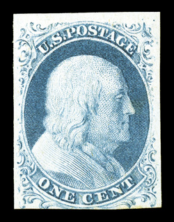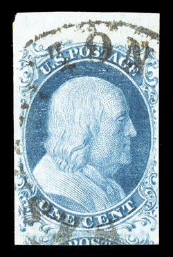outstanding impression as well on bright paper, neat face-free town postm#7, 1c Blue, Ty. II, a truly superb used example, possessing four huge and perfectly balanced margins, even its color is out of the ordinary, being unusually deep and rich, outstanding impression as well on bright paper, neat face-free town postmark confined to the bottom right corner, an extremely fine used gem in every respect; 1989 PF certificate; ex-Yost. (Image) $170.00