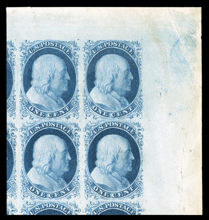 stamps, marvelously rich color and an outstanding impression, some mi#7, 1c Blue, Ty. II, a spectacular unused top right corner sheet-margin block of four, being positions 9-10/19-20R2, huge margins showing significant portions of five adjoining stamps, marvelously rich color and an outstanding impression, some minor selvage creasing, bottom right stamp with small internal tear, extremely fine appearance; a visually striking One Cent 1851 block of four; 1981 PF certificate. (Image) $5,500.00