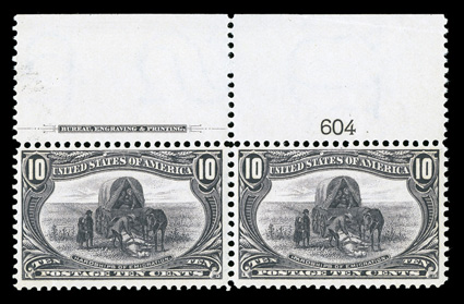 382 nh 290 290, 10c Trans-Mississippi, top margin imprint and plate no. 604 pair, nicely centered within large margins, deeply rich color on bright paper, o.g., never hinged, there is a