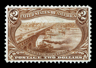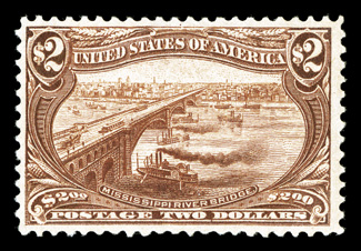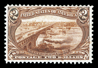 390 og 293 293, $2.00 Trans-Mississippi, deep vibrant color, better centering and much larger margins than usual, o.g., lightly hinged, very fine 1988 PF certificate.#293, $2.00 Trans-Mississippi, deep vibrant color, better centering and much larger margins than usual, o.g., lightly hinged, very fine; 1988 PF certificate. (Image) $2,100.00