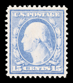 never hinged, very fine never hinged copies are especially difficult#366, 15c Pale ultramarine on bluish paper, desirable "post office" fresh mint example, with wonderfully bright color and a clean impression, nicely centered, unblemished o.g., never hinged, very fine; never hinged copies are especially difficult to come by; photocopy of a 2004 PSE certificate for a block of four, this being the bottom left stamp, as well as a 2006 PSE certificate as a single (VF 80; SMQ $2,700.00). (Image) $3,500.00