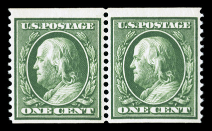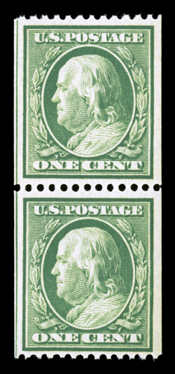 446 nh 348 348, 1c Green coil, perf. 12 horiz., handsome guide line pair, exceedingly well centered, rich color, o.g., never hinged, extremely fine 2003 PF certificate.#348, 1c Green coil, perf. 12 horiz., handsome guide line pair, exceedingly well centered, rich color, o.g., never hinged, extremely fine; 2003 PF certificate. (Image) $600.00