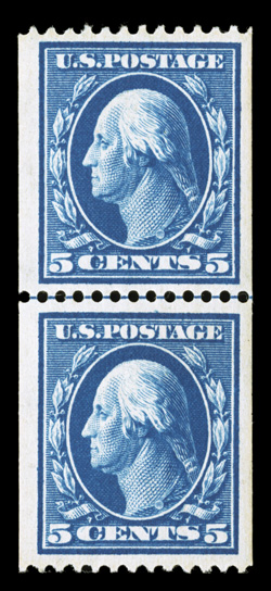 449 og 351 351, 5c Blue coil, perf. 12 horiz., a gem guide line pair in the most spectacular quality possible, being especially well centered within huge margins which are most uncommon