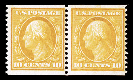 omission) cataloged as two singles.#356, 10c Yellow coil, perf. 12 vert., rare mint pair, radiant color, o.g., left stamp faintly hinged, right stamp never hinged, fine; 1991 PF certificate (never hinged by omission); cataloged as two singles. (Image) $10,250.00+