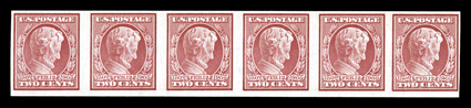 stamp with a heavier crease that ends in a small tear at bottom), ov#368H, 2c Lincoln imperforate coil, horizontal format, very scarce strip of six, quite fresh, rich color, nicely margined, o.g., n.h., some natural vertical gum bends (far right stamp with a heavier crease that ends in a small tear at bottom), overall very fine; 2009 PF certificate. (Image) $1,550.00+