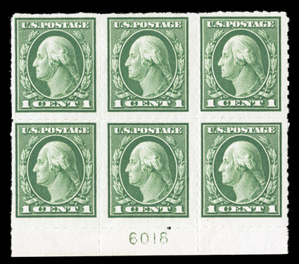 block.#403, 5c Panama-Pacific, perf. 10, full left margin plate no. 6138 block of six, rich color, o.g., never hinged, a few natural gum skips, fine; a scarce commemorative plate block. (Image) $6,750.00