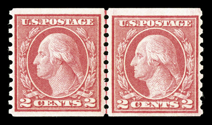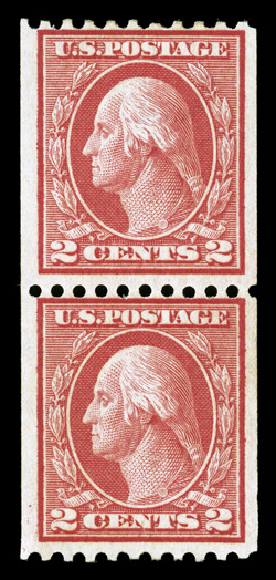 pair 2001 PF certificate.#453, 2c Carmine rose rotary coil, Ty. I, perf. 10 vert., joint line pair, brilliantly fresh, rather well centered, immaculate o.g., n.h., nearly very fine for this scarce line pair; 2001 PF certificate. (Image) $1,550.00