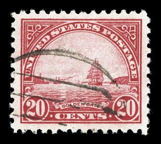 faint horizontal crease and a small tear at bottom, fine appearance th#613, 2c Harding, rotary press printing, perf. 11, a collectable used example of this major 20th Century rarity, typical centering, strong impression, light machine cancel, faint horizontal crease and a small tear at bottom, fine appearance; there are only 43 confirmed singles of this stamp, as well as a pair and a strip of three; 1994 PF certificate. (Image) $45,000.00