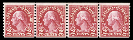 o.g., n.h., third stamp with small natural inclusion, fine-very fine.#599, 599A, 2c Carmine coil, Ty. I and Ty. II combination joint line pair, contained in a strip of four, the left stamps being Ty. II and the right stamps Ty. I, vibrant color, o.g., n.h., third stamp with small natural inclusion, fine-very fine. (Image) $1,625.00+