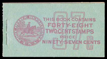 perf. separations, top right of front cover with minor crease mention#BK82a, Unexploded booklet of eight 2c Carmine lake panes of six (#634e), an extremely rare complete booklet of the rare carmine lake pane, quite fresh, the top pane with a few perf. separations, top right of front cover with minor crease mentioned only for strict accuracy, o.g., n.h., fine-very fine; the booklet pane itself rarely comes up (we have offered only one in our auctions), but to find an unexploded booklet containing eight of these panes is truly incredible; this is the first booklet of #BK82a we have ever seen; 2009 APS certificate; Scott lists the booklet but does not price it, therefore cataloged simply as eight panes. (Image) $32,000.00+