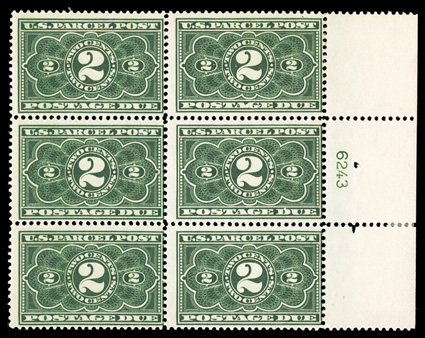 fine.#JQ2, 2c Dark green parcel postage due, scarce full right margin plate no. 6243 block of six, strong color, o.g., lightly hinged, vertical gum skip line in left stamps, fine. (Image) $3,750.00