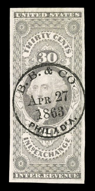 1863Philada. circular handstamp cancel, extremely fine 2005 PF ce#R52a, 30c Inland Exchange, imperforate, premium quality used example, four large and nicely balanced margins, strong rich color, gorgeous central strike of "B.B. & Co./Apr 27, 1863/Philad'a." circular handstamp cancel, extremely fine; 2005 PF certificate. (Image) $65.00