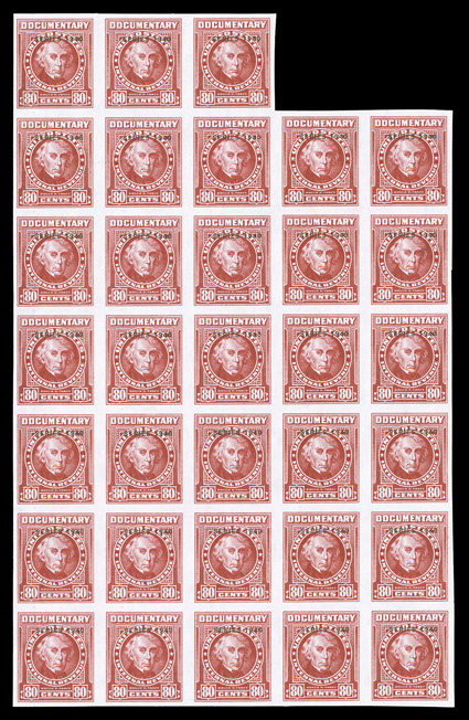 positions 3 and 6, shallow thin in position 13, very fine an unusu#R299a, 80c Carmine with "Series 1940" overprint, imperforate, without gum as issued, irregular block of 33, large margins all around, bright and fresh, small scissor cut between positions 3 and 6, shallow thin in position 13, very fine; an unusually large size multiple; cataloged as six blocks of four and four pairs. (Image) $10,300.00+