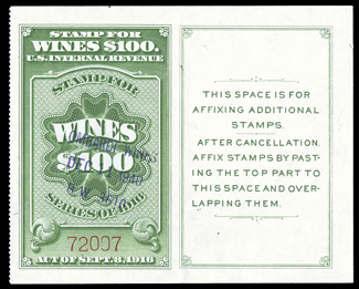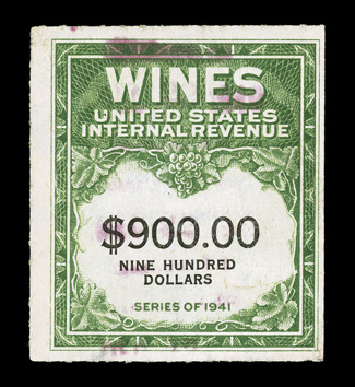 handstamp, quite well centered, and with rich colors, there is some light soil#RE168, $900.00 Yellow green and black, an incredibly rare used example of a stamp that is missing from virtually all revenue collections, with a lightly struck purple handstamp, quite well centered, and with rich colors, there is some light soiling and several thin areas, these flaws are of little consequence when presented with the opportunity to acquire a stamp that exists in miniscule numbers, very fine appearance; 1999 PSE certificate; ex-Joyce, Lyons. (Image) $4,000.00