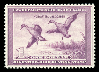 $890.00).#RW1, 1934 $1.00 Blue, exceptionally well centered and margined, strong color, o.g., n.h., extremely fine; 2005 PSE and 2007 PF certificates (both grading VF-XF 85; SMQ $890.00). (Image) $800.00