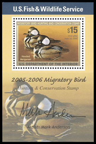 735 nhu RW72b RW72b, 2005 $15.00 Multicolored souvenir sheet of one, signed by the artist, pristine mint example of this scarce modern issue, unusually well centered, o.g., n.h., extremely