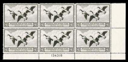early hunting permit plate blocks, o.g., n.h., very fine an attract#RW2,1935 $1.00 Rose lake, top right margin plate no. F131982 block of six, nicely centered and with rich color, plus it is virtually free of the gum bends and skips that plague early hunting permit plate blocks, o.g., n.h., very fine; an attractive and uncommonly choice plate block. (Image) $11,500.00