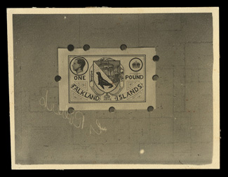 set of the five values but not cut down and showing backgrounds ve1936 Edward VIII Photographic Essays of the 1/-, 2/6, 5/-, 10/- and £1 as adopted for the 1938-50 set, mounted on brown card, signed and dated by the Artist, also includes another set of the five values but not cut down and showing backgrounds very fine; an extremely rare group of essays. (imagea) (Image) Est. $1,000-1,500