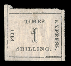 otherwise very fine original gum examples of the Fiji Times stamps arS.G. #9, 1871 1/- Black on rose "Fiji Times Express", position 7, desirable mint single, full roulettes on two sides, sharp impression, original gum, minor h.r., light crease, otherwise very fine; original gum examples of the Fiji Times stamps are particularly rare; signed Holcombe and accompanied by a clear 1999 Brandon certificate; ex-Sir Gawaine Baillie (Scott #10; $1,500.00). (Image) £1,300