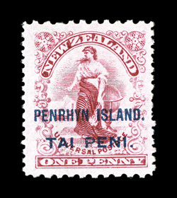 characteristic of the compound perforations, very fine an enormously rare BritS.G. #11, 1902 1p Carmine surcharged "PENRHYN ISLAND./TAI PENI." in blue, compound perforated 11x14, well centered, bright color, o.g., typical irregular perforations characteristic of the compound perforations, very fine; an enormously rare British Oceana stamp that is on every serious collector's want list; ex-"Samos", "Sovereign" (Scott #6b; $13,000.00). (Image) £15,000