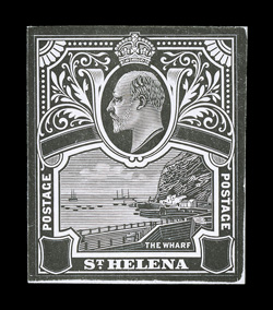 946 E   1903 King Edward VII and The Wharf essay in black on card, stamp size essay with blank value tablets, very fine and seldom seen.1903 King Edward VII and The Wharf essay in black on card, stamp size essay with blank value tablets, very fine and seldom seen. (Image) Est. $200-300