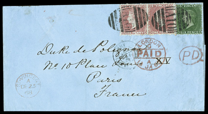 at bottom left, London Paid transit, French receiver, quitS.G. #5, 7, 1863-68 1p Rose red, 6p Deep green, pair of 1p and single of 6p tied by "A10" in barred oval to folded cover to Paris, France, neat red "St. Vincent/A Dec 25/68" datestamp at bottom left, London Paid transit, French receiver, quite fresh, very fine and scarce (Scott #5, 8). (Image) Est. $1,000-1,500