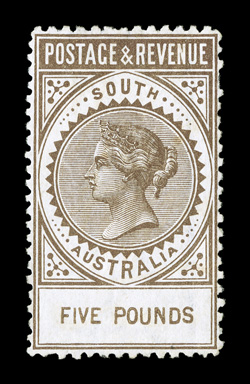 by his clear 1982 Friedl certificate, as well as a 2008 BPA certiS.G. #205, 1896 £5 Brown, unused, well centered, rich color, current certificate states "tone spots reduced" which is hardly detectable on the face; signed H. Bloch and accompanied by his clear 1982 Friedl certificate, as well as a 2008 BPA certificate; ex-Passano, "Sovereign" (Scott #90A; $4,000.00). (Image) £2,500
