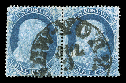 this scarce stamp are quite elusive, particularly in this premium c#18, 1c Blue, Ty. I, horizontal pair, positions 27-28R12, exceptionally well centered, deep rich color, central strike of a bold "New-York/Jul 3" c.d.s., extremely fine; pairs of this scarce stamp are quite elusive, particularly in this premium condition; 1992 PF certificate. (Image) $1,500.00