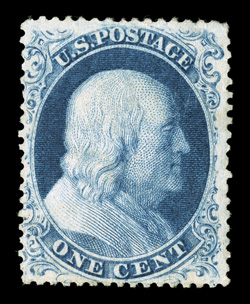 small corner crease and faint thin spot (latter not mentioned on accomp#21, 1c Blue, Ty. III, position 59L4, rare unused example, strong rich color and an excellent clarity of impression on fresh white paper, well centered and margined for this, small corner crease and faint thin spot (latter not mentioned on accompanying certificate), very fine appearance; 2005 PF certificate. (Image) $7,000.00